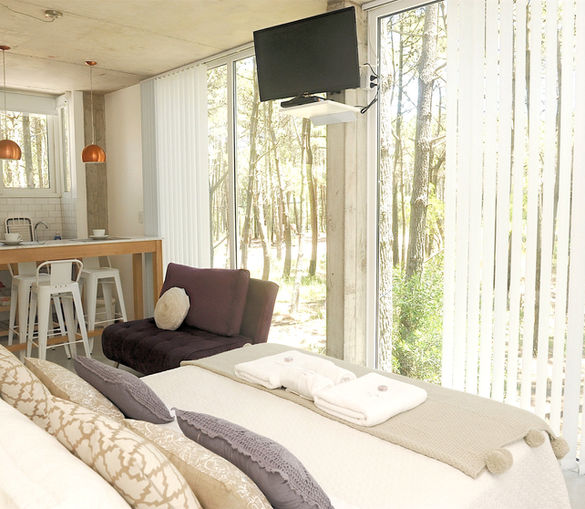 Vidriados de piso a techo, dejando asi que el interior se confunda con el afuera, haciendolo ideal para quien guste amanecer con vistas inspiradoras, desayunar en la moderna barra de marmol mirando el bosque o mismo tomar un baño relajante en el jacuzzi doble. Capacidad dos personas.